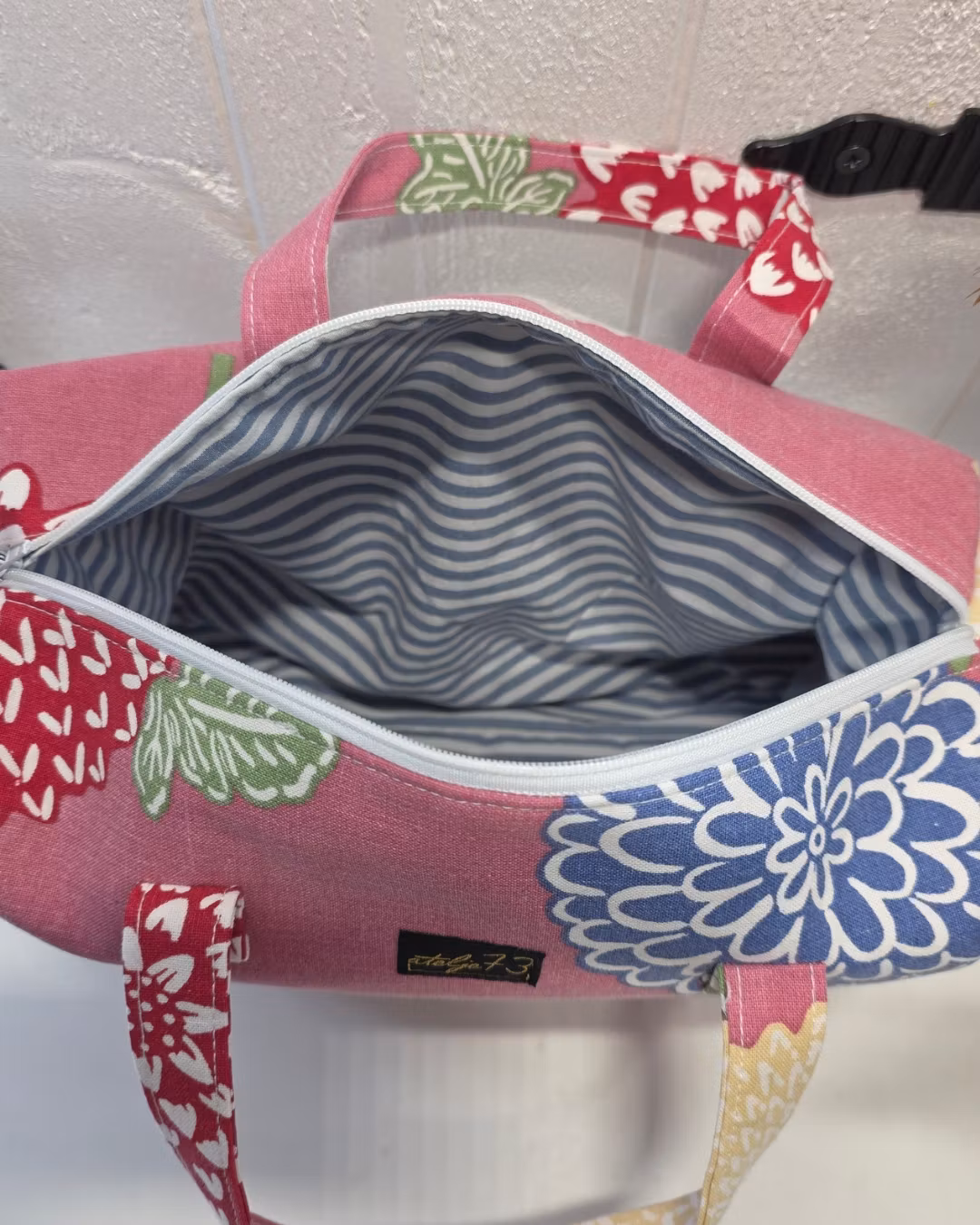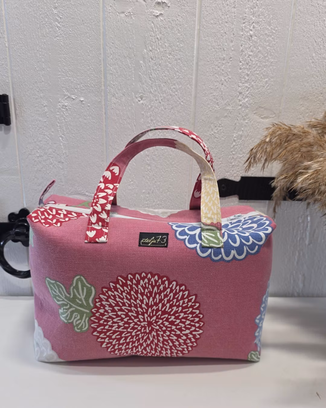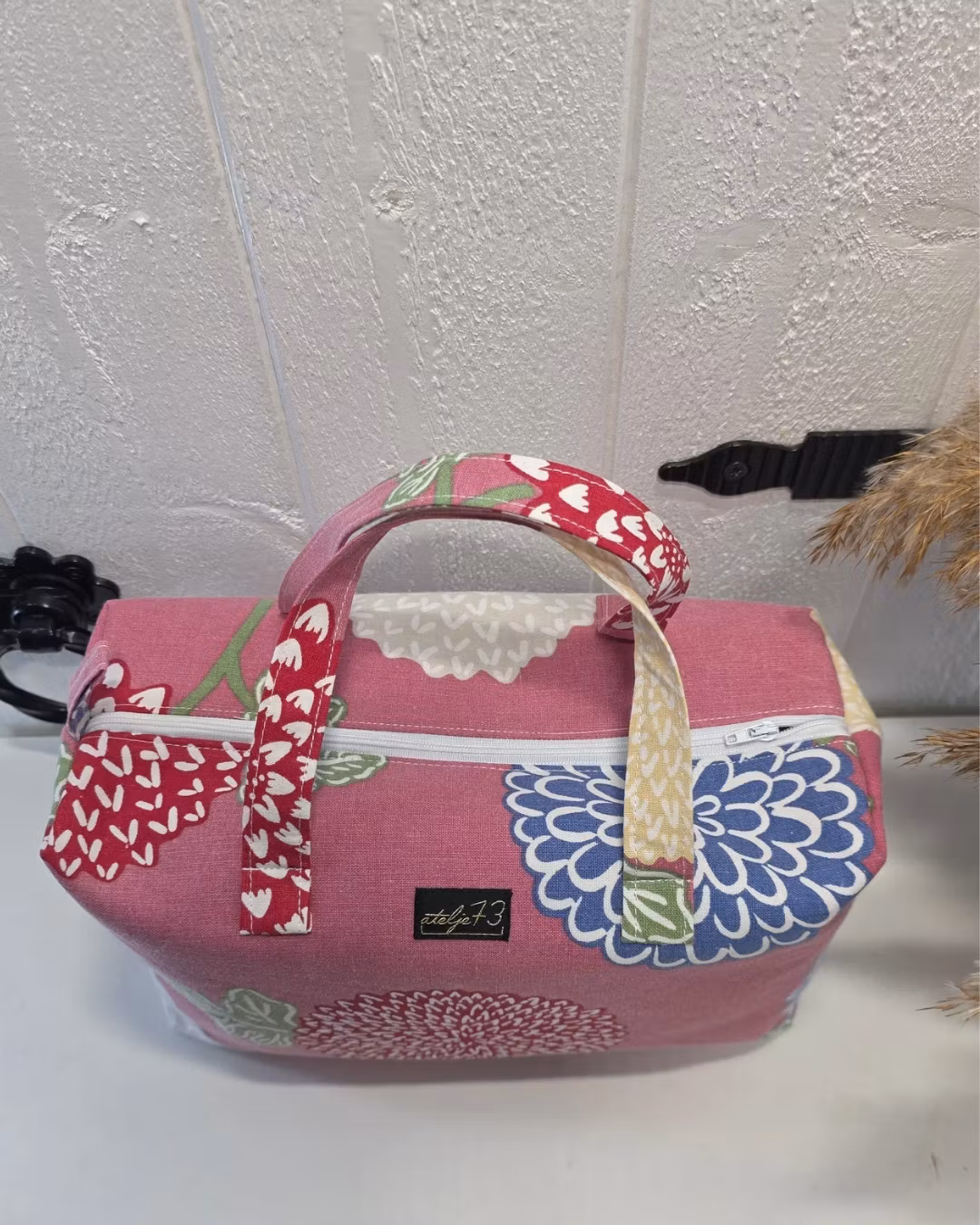 Här hittar du en liten necessär som även kan användas som en väska. Den är handgjord med omsorg och har två praktiska handtag, ett stort huvudfack samt en dragkedja för att enkelt öppna och stänga. Invändigt är den fodrad med bomullstyg.