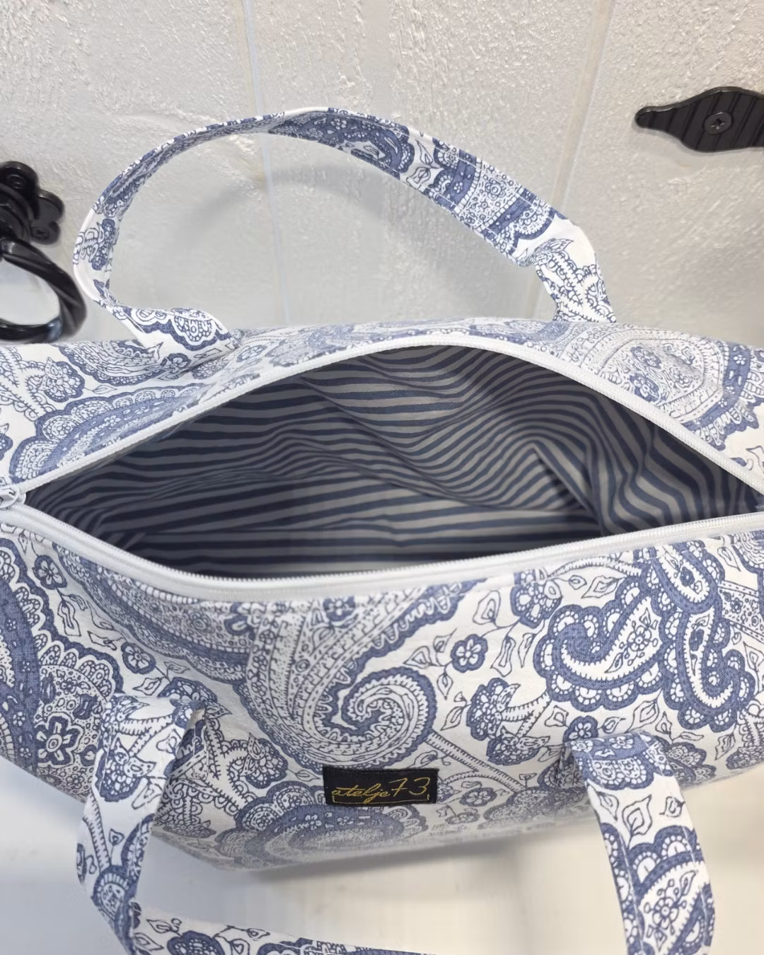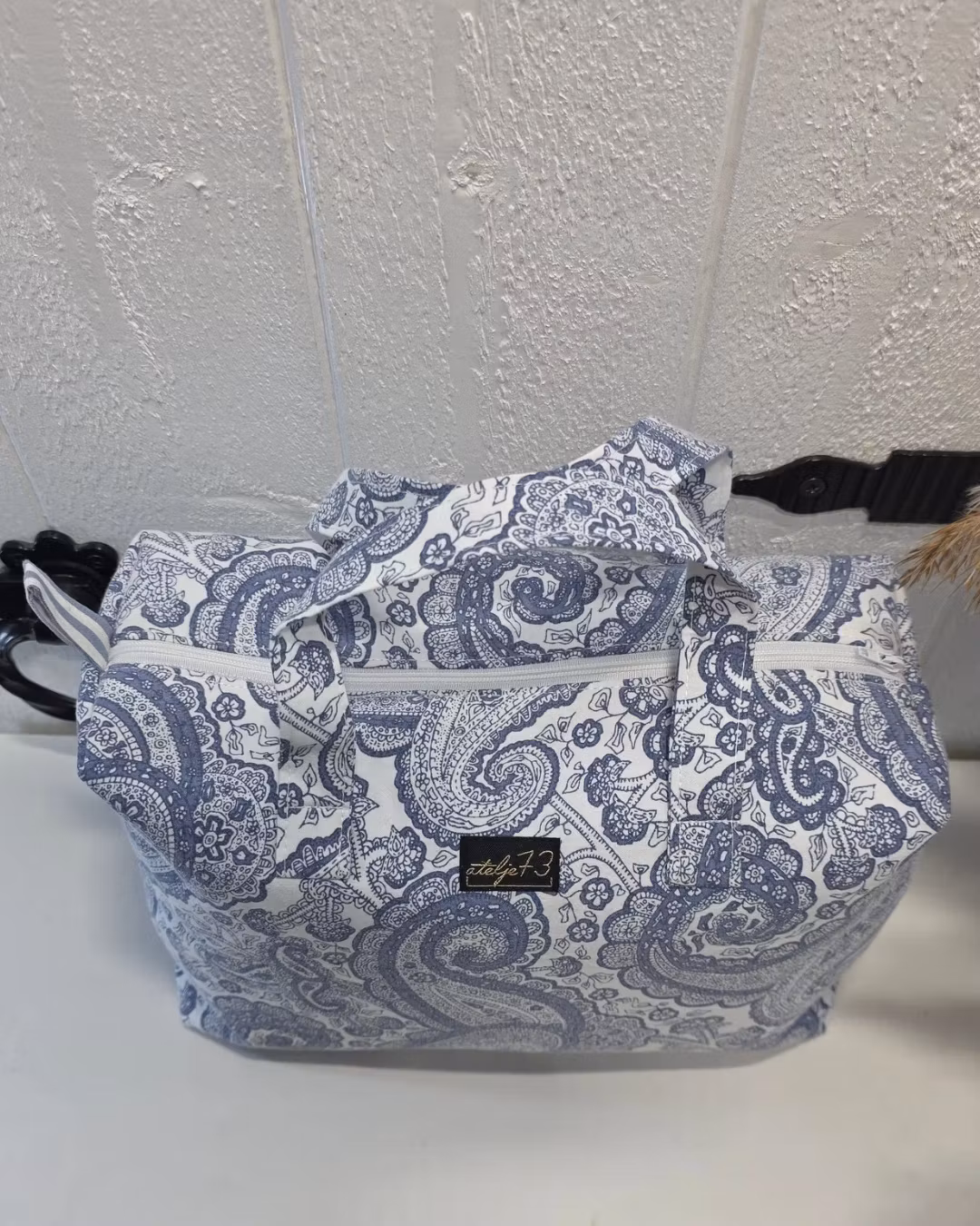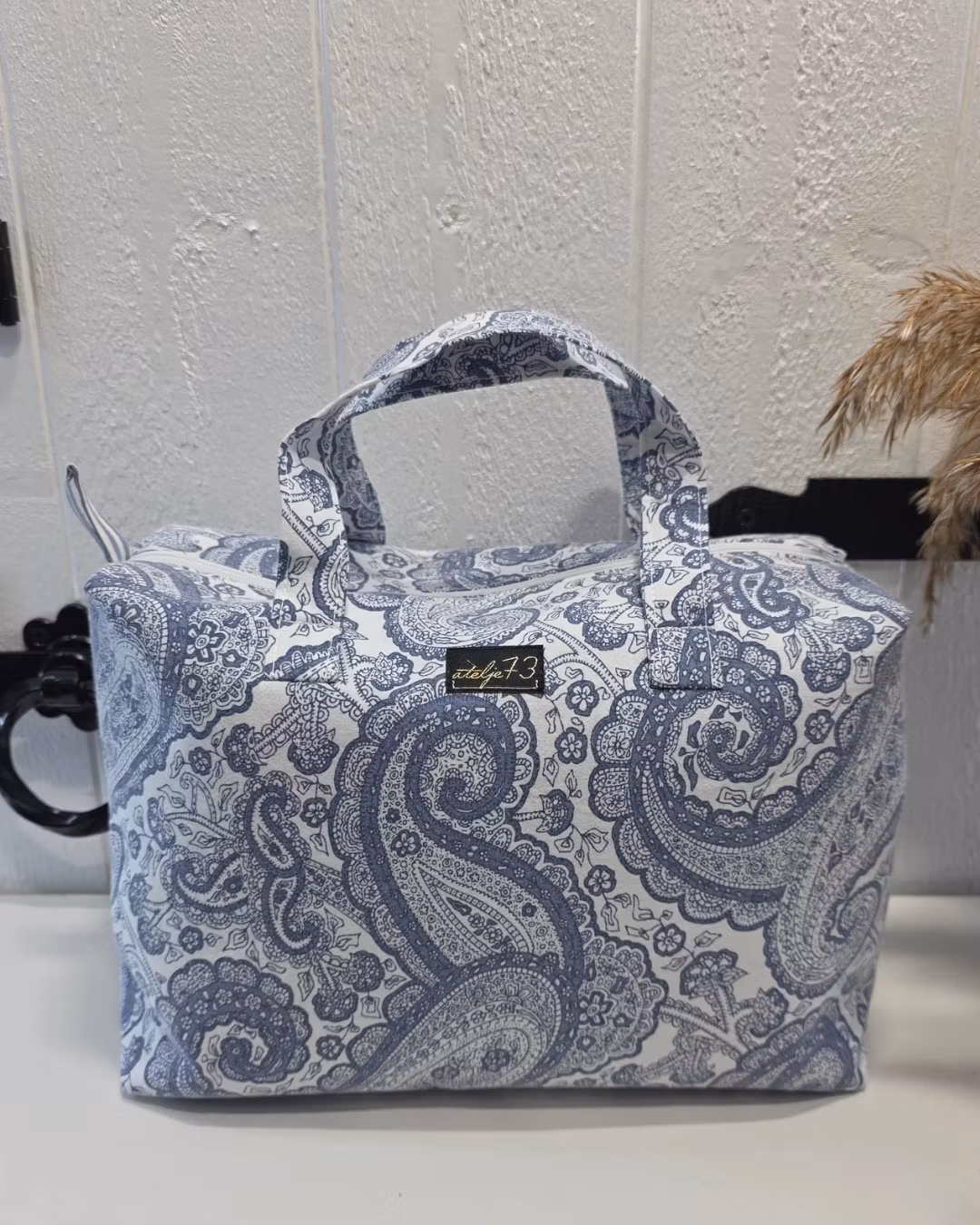 Här hittar du en liten necessär som även kan användas som en väska. Den är handgjord med omsorg och har två praktiska handtag, ett stort huvudfack samt en dragkedja för att enkelt öppna och stänga. Invändigt är den fodrad med bomullstyg.