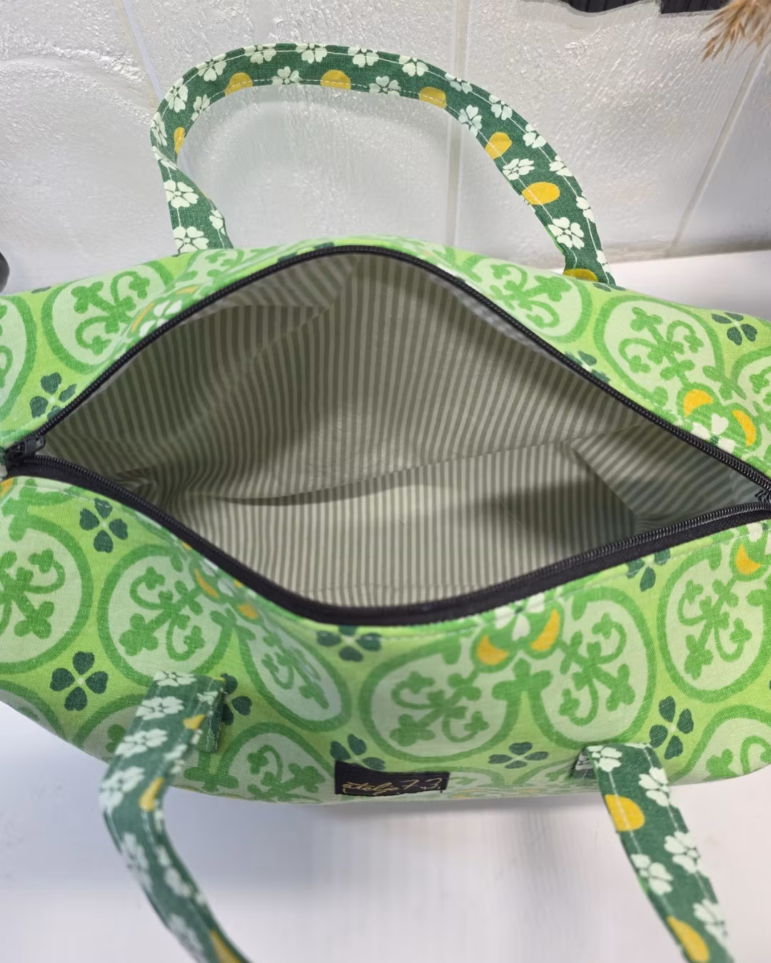 Här hittar du en liten necessär som även kan användas som en väska. Den är handgjord med omsorg och har två praktiska handtag, ett stort huvudfack samt en dragkedja för att enkelt öppna och stänga. Invändigt är den fodrad med bomullstyg.
