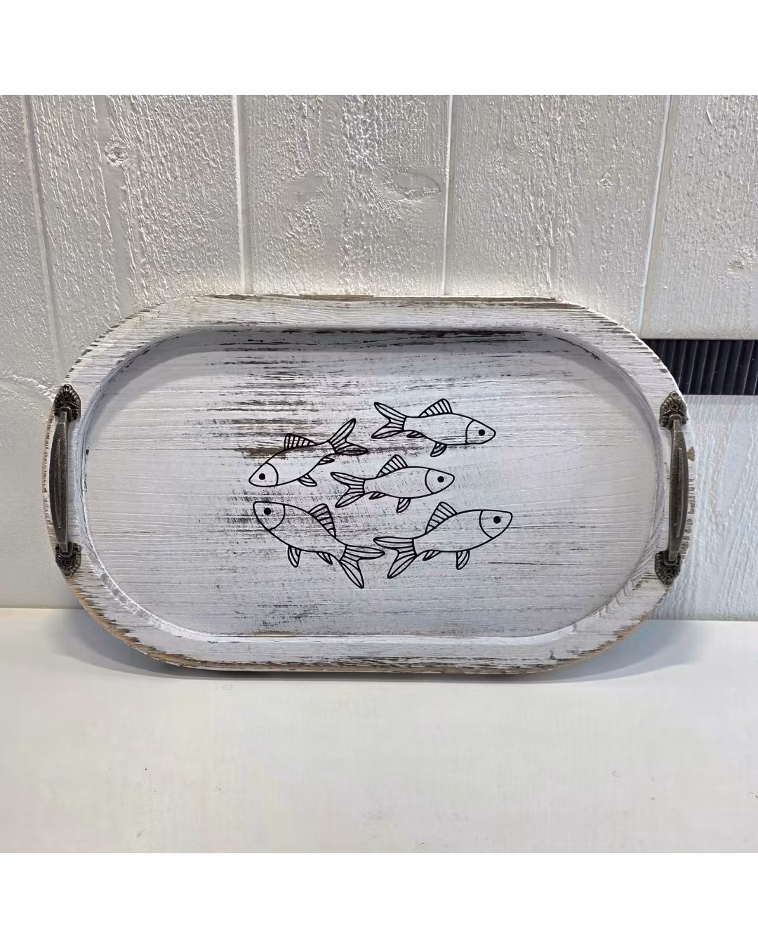 En dekorativ träbricka med motiv av ett fiskstim– skapad för dig som dras till havet, horisonten och den tidlösa skärgårdskänslan. Med sin naturliga träfinish och sitt stilrena tryck blir brickan ett vackert inslag i både kök, vardagsrum och sommarhus.